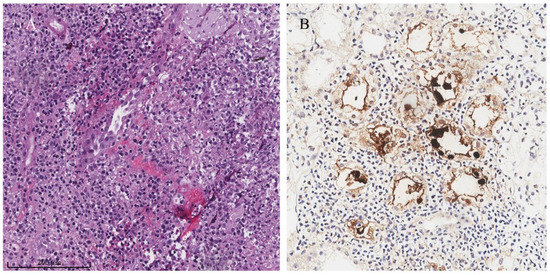 The pathological features of adenovirus nephritis include marked tubular necrosis and interstitial inflammation [27,28]. Tubular necrosis can be severe and illustrates tubular basement membrane disruption, frank tubular destruction, and mimics cortical necrosis [53]. Hemorrhagic interstitial nephritis can also be observed with granulomatous formation. In the inflamed necrotic tubules, enlarged, smudgy, basophilic viral nuclear inclusion is presented (Figure 4A), which is similar to those found in BKVAN. A recent study indicated that adenovirus nephritis had less interstitial fibrosis compared to BKVAN, possibly due to the increased transcripts of the host immune response inhibition in the kidney allograft tissue of recipients with adenovirus nephritis [6]. The confirmation of adenovirus nephritis involved positive immunohistochemical staining against adenovirus in the affected renal tubular epithelial cells (Figure 4B). Compared to BKV, electron microscopic examination of adenovirus showed a larger virion at approximately 70 to 80 nm [53].