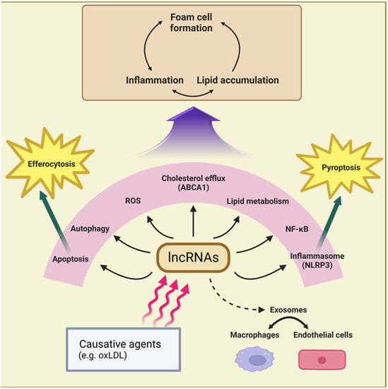 Macrophage lncRNAs are induced by causative agents, such as oxLDL, and affect atherogenesis by regulating a wide range of processes including NF-κB activation, ROS generation, cholesterol efflux, apoptosis, efferocytosis, autophagy, inflammasome formation, and pyroptosis. These processes lead to lipid accumulation, proinflammatory activation, and foam cell formation in macrophages (Figure 1). Similarly, macrophage lncRNAs play a role in sepsis development by regulating inflammation, ROS generation, and M1 polarization (Figure 3). Pyroptosis and apoptotic cell death are crucial factors affecting sepsis progression [89,90], and macrophage lncRNAs that mediate these processes in sepsis are expected to be revealed soon. While many lncRNAs have been found to be transferred by exosomes in atherosclerosis, exosomal lncRNA has not been detected in conditions associated with sepsis.
