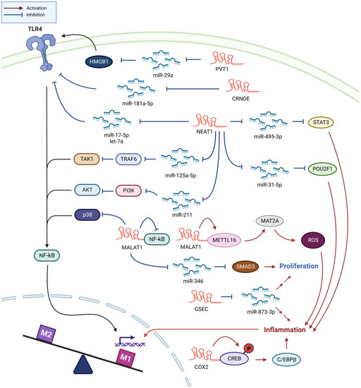 Previous studies have found a considerable increase in NEAT1 levels in serum of patients with sepsis and septic mouse models [73,74,75,76]. These studies agree that NEAT1 is involved in the inflammatory activation of macrophages; however, the targets of its action differ. In THP-1 cells, LPS-induced NEAT1 expression enhances inflammatory responses by modulating the miR-17-5p/TLR4 axis [76]. LPS-stimulated Kupffer or RAW264.7 cells exhibit the expression of NEAT1, which exerts its proinflammatory activities through the Let-7q/TLR4 axis [73]. Other studies have reported that NEAT1 promotes inflammation in LPS-treated RAW264.7 cells by modulating the miR-495-3p/signal transducer and activator of transcription 3 (STAT3), miR-211/phosphoinositide 3-kinase (PI3K)/protein kinase B (AKT), miR-370-3p/thrombospondin-1, or miR-31-5p/POU domain, class 2, transcription factor 1 (POU2F1) axes [74,75,77]. Wang et al., reported that this effect of NEAT1 was mediated through the miR-125a-5p/TNF receptor-associated factor 6 (TRAF6)/TGF-β-activated kinase 1 (TAK1) axis and that the downregulation of NEAT1 expression promoted M2 polarization [78]. Thus, NEAT1 expressed in activated macrophages enhances their proinflammatory activity. As most previous experiments have been performed using cell lines, additional studies involving animal models or primary macrophages isolated from patients with sepsis are warranted to confirm the role of NEAT1 in sepsis progression.