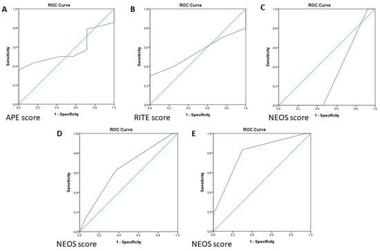 (A) ROC (Receiver operating characteristic curve) analysis of the APE score for autoantibody prediction. (B) ROC analysis of the predictive value of the RITE score for favorable immunotherapy response. (C) ROC analysis of the NEOS score in anti-NMDAR encephalitis at discharge. (D) ROC analysis of the NEOS score for all AE patients at discharge. (E) ROC analysis of the NEOS at 1 year follow-up/long-term follow-up for all 26 patients except one lost to follow-up. ROC, receiver operating characteristic.
