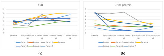 A significant improvement in KrU levels was found. It increased from 4.91 ± 1.14 mL/min to 7.28 ± 1.68 mL/min (p = 0.028) at 12 months (Figure 1a). Urine volume increased from 1742 ± 288 mL/24 h to 2021 ± 532 mL/24 h, and 24 h creatinine clearance also increased from 12.7 ± 3.53 mL/min to 16.35 mL/min ± 6.85 (p = 0.26) but was not significant. Urine albumin/creatinine ratio (UACR) and 24 h proteinuria were also significantly reduced at the end of the study. UACR dropped from 4040 ± 2729 mg/g to 1568 ± 746 mg/g (p = 0.016) and 24 h proteinuria from 4.10 ± 1.95 g/24 h to 1.88 ± 0.71 g/24 h (p = 0.028) (Figure 1b).