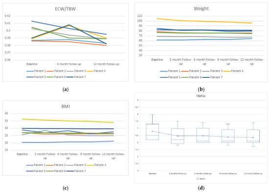 Changes in ECW/TBW (a), weight (b), BMI (c), and glycated hemoglobin A1c (HbA1c) (d) with respect to their baseline.