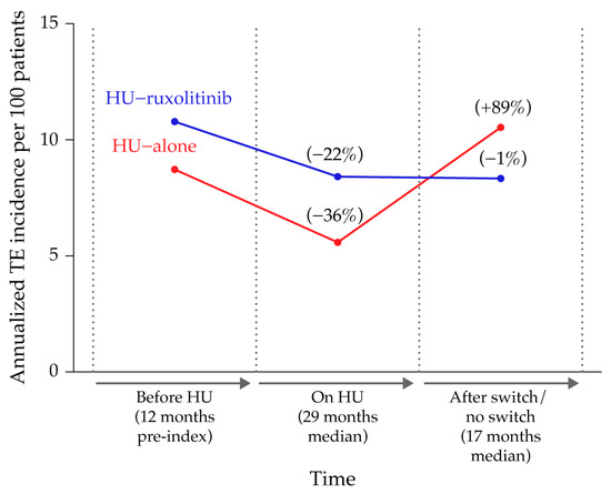 Before treatment, the baseline annualized IR of TE per 100 patients in the HU-alone and HU-ruxolitinib cohorts were 8.7 and 10.8, respectively. During the initial period of HU treatment, the IRs decreased to 5.6 and 8.4 in the HU-alone and HU-ruxolitinib cohorts, respectively. In patients who subsequently switched to ruxolitinib (HU-ruxolitinib), the IR remained stable at 8.3; however, for those who continued HU (HU-alone), the IR appeared to rebound and increased markedly to 10.5 over the switch/no switch period (Figure 3).