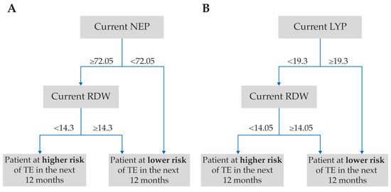 Clinical decision trees developed for the synergistic variable pairs in patients without a history of TE: (A) NEP and RDW, and (B) LYP and RDW. The thresholds are those identified as significant for these synergistic variable pairs (see Figure 4A,B) and are based on laboratory values taken 3–6 months post-index for patients receiving HU. NEP, LYP and RDW are %. HU = hydroxyurea; LYP = lymphocyte percentage; NEP = neutrophil percentage; RDW = red cell distribution width; TE = thromboembolic event.