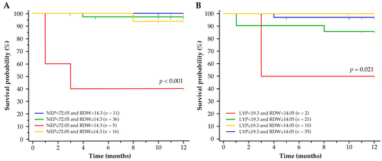 TE-free survival rate over time in patients without a history of TE, based on the median values for the top two synergistic variable pairs: (A) NEP and RDW, and (B) LYP and RDW. The p values (by log-rank) denote significant differences between the synergistic pairs, RDW < 14.3 and NEP ≥ 72.05 group (panel A) or the RDW < 14.05 and LYP < 19.3 group (panel B) and the other threshold groups investigated for the same two variables. NEP, LYP and RDW are %. LYP = lymphocyte percentage; NEP = neutrophil percentage; RDW = red cell distribution width; TE = thromboembolic event.