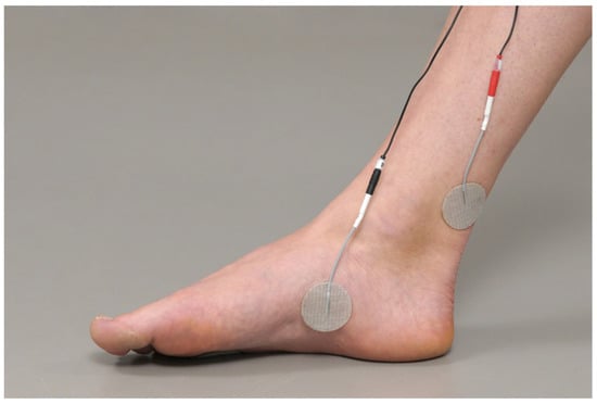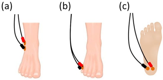 - The lateral malleolus [6], with one electrode placed 4–5 cm proximal and 4–5 cm posterior to the lateral malleolus and the second electrode placed 3–4 cm proximal to the first one (Figure 1a);