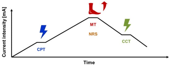 Thresholding procedure: gradual increase of stimulation intensity [mA] until the subject reports the current perception threshold (CPT); continued increase of stimulation intensity until first triggered movement (motor threshold (MT)) accompanied by a pain assessment (numerical rating scale (NRS) 0–10); gradual decrease of stimulation intensity until the subject reports the current cessation threshold (CCT).