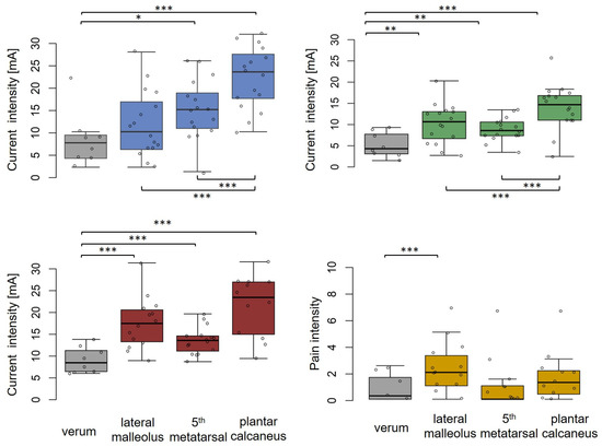 For the first round of testing, a pair of equally sized electrodes were placed at every sham position (a total of six electrodes with a diameter of 2.5 cm, or 3.2 cm, respectively). The three different electrode positions were investigated in sequence, according to the assigned order of stimulation (randomised among the three positions and two electrode sizes). The electrodes for the first position were connected to the ELPHA II 3000 device and the current amplitude was slowly increased (approximately 1 mA/s) (Figure 3). The subjects were asked to report the first sensation, which was defined as the sensory threshold (current perception threshold—CPT; throughout the manuscript coloured blue) using the methods of limits [35]. In addition, the subjects were asked to describe their sensation (localisation of the stimulation and what they felt, e.g., tingling, prickling). The stimulus intensity was further increased in order to see if a motoric response with contraction/movement of the foot muscles could be provoked, i.e., the motor threshold (MT; throughout the manuscript coloured red) for this specific electrode placement. The MT was further characterized regarding the triggered movement (toe fanning, muscle twitch, pulsation) and corresponding localization (e.g., first, second toe). In addition, the subjects indicated whether the stimulation was painful at the time of the motor response using a Numerical Rating Scale (NRS) ranging from 0 to 10 in which 0 = “no pain” and 10 = “worst pain imaginable” [36]. As a next step, the stimulus intensity was gradually decreased until the subjects reported the cessation of the sensation (current cessation threshold—CCT; throughout the manuscript coloured green). To ensure the reliability of the responses, the sensory and motor assessments were replicated (a minimum of two times, possibly more, until consistent and reliable values were obtained). Following this, the electrodes from the second sham position (according to the randomised order) were connected to the stimulator and the same standardised procedure as described above was performed for the second and third sham positions (Figure 1).