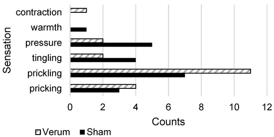 Subjective sensations reported by the patient for verum (hatched) and sham stimulations (multiple terms could be named per stimulation). The patient was asked to freely express her perception of the stimulation at the time of the occurrence of the motor response. Counts of the same responses are shown as bars per category for verum and sham stimulations.