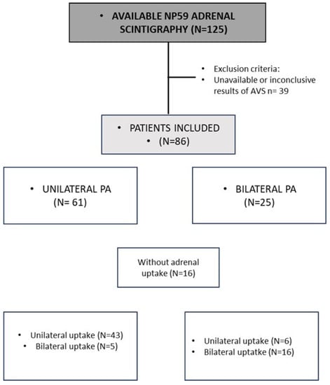 Patients with PA in follow-up between January 2018 and December 2022 were enrolled in 30 Spanish tertiary hospitals (SPAIN-ALDO registry). When the data were analyzed (7 April 2023), a total of 833 patients had been included in the database. The inclusion criteria to enter this specific study were the following: (i) available results of a NP-59 adrenal scintigraphy for the subtyping diagnosis of PA and demonstration of complete biochemical cure after adrenalectomy; or (ii) available results of a NP-59 adrenal scintigraphy for the subtyping diagnosis of PA and available AVS demonstrating unilateral or bilateral PA or bilateral adrenal nodules >1 cm in CT/MRI. A total of 125 patients underwent adrenal scintigraphy, of whom 86 met inclusion criteria and had been evaluated in 14 centers. These patients were classified in two groups: (i) UPA if biochemical cure was achieved (based on the PASO classification system [13]) after adrenalectomy or/and if the lateralization index in AVS > 4 with ACTH or > 2 without ACTH stimulation (n = 61); and (ii) Bilateral PA (BPA) if lateralization index in AVS was ≤ 4 with ACTH or ≤ 2 without ACTH stimulation or if there was evidence of bilateral adrenal nodules >1cm in the CT/MRI (n = 25) (Figure 1).