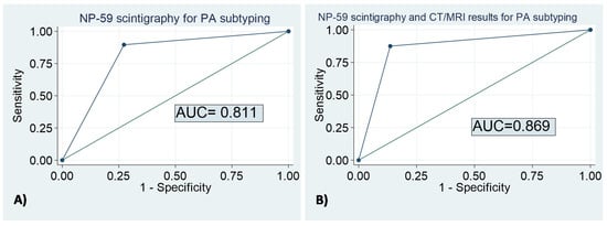 Accuracy of the NP-59 scintigraphy for the subtyping of primary aldosteronism. (A) The results of the NP-59 scintigraphy to differentiate between UPA and BPA yielded an area under the ROC curve (AUC) of 0.812 [0.707–0.916]; (B) The results of the NP-59 scintigraphy combined to the CT/MRI results to differentiate between UPA and BPA yielded an AUC) of 0.869 [0.782–0.957].