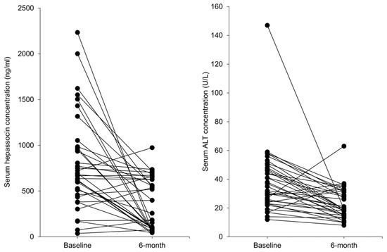 Decrement in serum hepassocin concentrations accompanied with improved hepatic function in subjects with hyperthyroidism. A total of thirty-six subjects with hyperthyroidism were enrolled and the serum samples were collected for the determination of serum hepassocin and alanine aminotransferase (ALT) concentrations at diagnosis (Baseline), and six months after the standard treatment of hyperthyroidism.