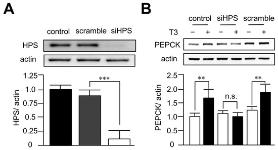 Deletion of hepassocin reversed the effects of triiodothyronine on phosphoenolpyruvate carboxykinase expression in HepG2 cells. HepG2 cells were transduced with a lentiviral vector containing short hairpin-RNA targeted to hepassocin (HPS) for 48 h to knockdown HPS (A). The cells were then treated with 10 mM triiodothyronine (T3) for another 24 h, and the cell lysates were harvested for the determination of phosphoenolpyruvate carboxykinase (PEPCK) by Western blots (B). ** p < 0.01 and *** p < 0.001 as compared with indicated groups. n.s.: not significant.