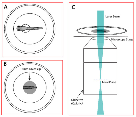 Schematic representation of the sample preparation right before FPALM imaging. (A) Fixed zebrafish in 35 mm MatTek dishes. (B) Deyolked zebrafish in same dish with 15 mm circular coverslip on top of the fish. (C) Sample placed on to the microscope stage with oil objective of 60× 1.4 NA.