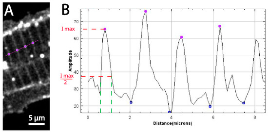 (A) Shows the cropped region of the muscle fiber imaged using the Leica DMi8 confocal and 25× water lens. Purple line with circles indicates the regions where the intensities of the pixels are measured. (B)Two-dimensional graph of intensities of pixels along a line within the image. X-axis represents distance in microns and Y-axis represents amplitude intensity. Purple dots show the position of maximum intensity and distance between maximum intensity represents the distance between the t-tubules. The width of the t-tubule (represented by green dotted line) was obtained by measuring the width at half maximum of the intensity peak, represented by a red dotted line.