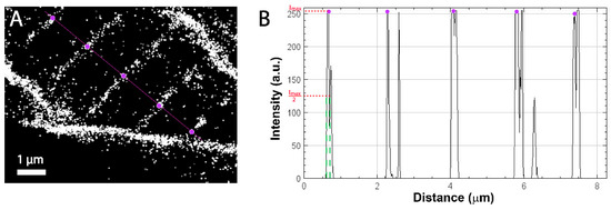 (A) Cropped region of the muscle fiber imaged using FPALM. The purple line shows the path along which the intensities of the pixels are measured. Purple circles show positions of intensity peaks. (B) Plot of pixel intensities vs. distance along the line shown in A. Purple dots show the positions of maximum intensity. The distance between intensity maxima represents the distance between the t-tubules. The apparent width of the t-tubule (represented by the green dotted line) was obtained by measuring the full width at half maximum of the intensity peak, represented by the red dotted line.
