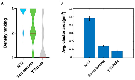 (A) Binning Dystroglycan densities by region on muscle fibers, with 3 as most dense and 1 as least dense. (B) Average cluster area of Dystroglycan clusters in MTJ, sarcolemma and t-tubule regions estimated by cluster analysis.