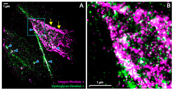 Muscle fiber adhesion is important for overall health. Muscle adhesion is mediated by the proteins Dystroglycan and integrin, which connect the muscle fiber to the surrounding ECM. Dystroglycan was known to localize to the zebrafish MTJ, sarcolemma, and t-tubule by confocal imaging and electron microscopy, but the exact distribution of the Dystroglycan at these structures in zebrafish muscle was unknown. Our FPALM imaging and analysis shows that Dystroglycan localizes in clusters with the most dense clusters at the MTJ, medium density at the sarcolemma surrounding the muscle fiber, and lower density at the t-tubule (Figure 6 and Figure 7). The ability to distinguish Dystroglycan clusters of various densities illustrates the advantages of super resolution compared to confocal for understanding nanoscale structure and organization of the muscle membrane. Electron microscopy enables finer resolution and has been used to image zebrafish muscle, but samples must be fixed and thinly sectioned first, meaning that the intact zebrafish embryo’s muscle cannot be imaged [50,51,52]. In addition to the cluster density of Dystroglycan at various points in the muscle fiber, we investigated whether colocalization of Dystroglycan and integrin occurred. Colocalization was expected due to molecular evidence of the interaction of Dystroglycan and integrin proteins and due to their mutual binding to laminin in the ECM, but it was not known previously if Dystroglycan and integrin colocalized in muscle. We found by FPALM that there is colocalization of DG and Itga7 at both the MTJ and in the muscle fiber (Figure 8).