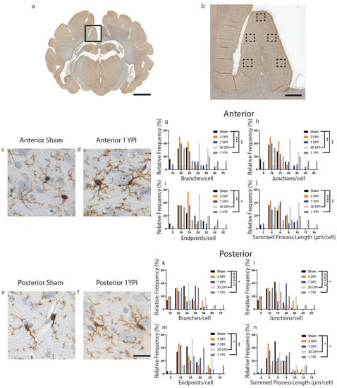 Microglia Become Hyper-ramified in the Cingulate Gyrus at One Month and Persist out to Chronic Time Points. A whole coronal section of Iba-1-stained tissue is shown with a call-out box centered around the cingulate gyrus (a, scale = 7 mm). Five call-out boxes in the cingulate gyrus depict the location of the 40× images (image n = 5 per animal) used for skeletal analysis (b, scale = 1 mm). Cropped 40× images for sham and 1 YPI are displayed showing the hyper-ramified morphology at 1 YPI (c–f, scale = 30 µm). Histograms display the range of data for each experimental group. There is a significant increase in the number of branches, junctions, process endpoints, and summed process length at 30 DPI and 1 YPI compared to sham in anterior sections of cingulate gyrus (g–j) and posterior sections of cingulate gyrus (k–n) (* p < 0.05, ** p ≤ 0.01, *** p ≤ 0.001, **** p ≤ 0.0001).