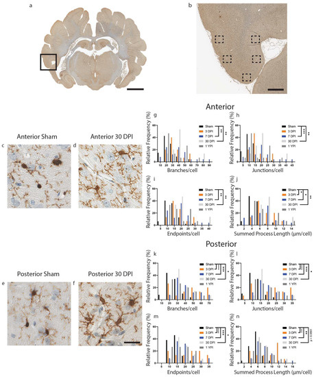 Next, we analyzed microglial morphological changes in layers II/III of the inferior temporal gyrus, a lateral cortical structure. In the inferior temporal gyrus, there were significant changes in microglia morphology detected in anterior sections of tissue compared to sham (Figure 2) (Table 3). Specifically, we found an increase in the number of branches, junctions, and endpoints at 7 DPI and 30 DPI, as well as an increase in summed process length per microglia at 3 DPI, 7 DPI, and 30 DPI. The number of branches per microglia increased (F (4112) = 5.697, p = 0.0003) at 7 DPI (p = 0.0015) and 30 DPI (p = 0.0040) compared to sham (Figure 2g). The number of junctions per microglia increased (F (4111) = 6.468, p = 0.0001) at 7 DPI (p = 0.0006) and 30 DPI (p = 0.0018) compared to sham (Figure 2h). The number of endpoints per microglia increased (F (4112) = 6.053, p = 0.0002) at 7 DPI (p = 0.0011) and 30 DPI (p = 0.0023) compared to sham (Figure 2i). Finally, the summed process length per microglia increased (F (4111) = 5.788, p = 0.0003) at 3 DPI (p = 0.0272), 7 DPI (p = 0.0140) and 30 (p = 0.0016) compared to sham (Figure 2j).
