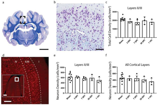 3.3. Total Cell Density and Neuron Density Did Not Change in the Cingulate Gyrus after Mild TBI