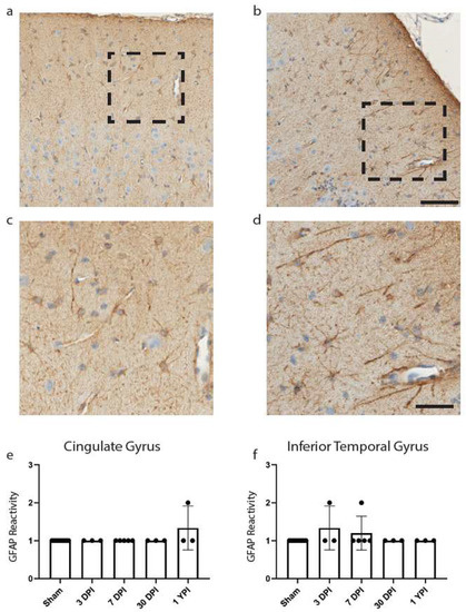GFAP Reactivity Does Not Change in the Cingulate or Inferior Temporal Gyrus. Examples of GFAP reactivity scored as a 1 (a) or 2 (b) are shown (scale = 100 µm) with corresponding call-out boxes for scores of 1 (c) or 2 (d; scale = 50 µm). No images were scored as a 3. There was no significant change in GFAP reactivity in cingulate gyrus (e) or inferior temporal gyrus (f). Each point represents data from an individual animal within each group.