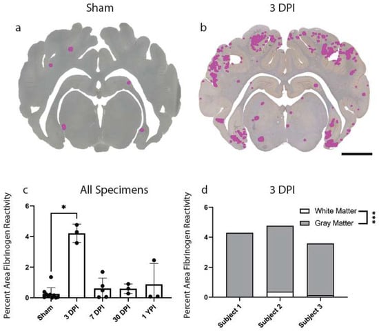 Fibrinogen Reactivity Increases at 3 DPI. Regions of fibrinogen extravasation are shown in sham (a) and 3 DPI (b) via Stereo Investigator software on whole coronal sections of tissue (scale = 1 cm). The percentage area of fibrinogen reactivity increased at 3 DPI (p = 0.0198) compared to sham before resolving by 7 DPI out to 1 YPI (c) (* p < 0.05). Each point represents data from an individual animal within each group. Fibrinogen annotation in gray versus white matter at 3 DPI demonstrated a statistically significant increase in gray matter (p = 0.0003) (d) (*** p ≤ 0.001).