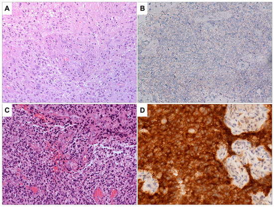 The results of the molecular characterization of glioblastoma samples are summarized in Table S2 of the Supplementary Materials section. All the patients were negative for ATRX mutation and positive for TP53 and GFAP expression and showed EGFR hyperexpression. The value of Ki-67 ranges from 10% to 40%. The histopathological examination showed high cellularity, the presence of pleomorphic nuclei, and areas of necrosis and diffuse neovascularization (Table S3 Supplementary Materials). The images reported in Figure 1 and Figure 2 depict the characteristics of glioblastoma IDH wild type. Figure 1A shows a highly cellular tumor in which microvascular proliferation is evident in the center of the microscopic field. The image in Figure 1B shows the immunohistochemical staining results for IDHR232H, a genetic marker commonly used to identify glioblastomas with IDH mutations. The neoplastic cells are negative for this marker, indicating that they do not carry this specific mutation. Figure 1C,D provide the control, representing a glioblastoma IDH mutant with the same staining as Figure 1A,B.