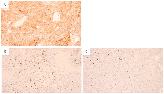 Glioblastoma, IDH wild type. (A) Immunohistochemical staining for EGFR, the neoplastic cells positive for EGFR are stained in orange (200×), so the sample is positive for EGFR. (B) Immunohistochemical staining for Ki67, numerous cells positive for Ki67 (stained in orange) are visible. Thus, a high proliferative activity is present (200×). (C) In the control sample, immunohistochemical staining for Ki67, in this sample is evident the presence of a few proliferative cells with orange staining. This indicates a low proliferation index.