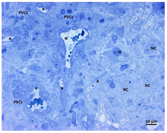 Light microscopy image of methylene blue stained semithin section. Magnification 400×, bar 10 microns. This picture shows a panoramic view of glioblastoma tissue. Neoplastic cells of glial origin (NC), vessels sections (*). A neuron (N) and its axon (A) are interspersed among fibrillar material and neoplastic cells. Small intercellular spaces (empty arrow), more extensive areas (open dotted arrow), and perivascular neoplastic cells (PVCs).