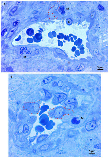(A,B) Light microscopy images of methylene blue stained semithin section. Magnification 1000×, bar 5 microns. Hyperplastic endothelial cells (E). Mitotic figures (M) are sometimes very close to the endothelium—intravasating neoplastic cells (dotted lines).