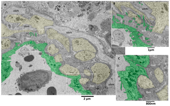 TEM, Glioblastoma small vessel wall. (A) Panoramic view of the vessel wall; note that a lymphocyte is visible in the lumen’s endothelial cells (green). The vessel basement membrane appears thickened, divided into two layers (inner basement membrane, ibm; outer basement membrane, obm), and penetrated by foot processes of astrocytes (yellow). (B) Endothelial cells (green) present cauliflower-like projections on their luminal surface (p), whereas the basal surface expresses long and deep finger-like projections (arrowheads) that penetrate the basement membrane to reach the astrocytes foot processes (yellow). (C) Astrocytes’ foot processes (yellow) appear separated by the endothelial cells (green) by an excellent layer of ibm fibers.