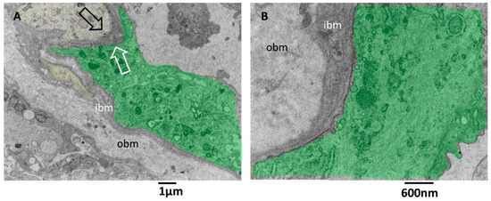TEM, Glioblastoma small vessel wall, the basement membrane. (A) The endothelial cell (green) is separated by a skinny layer (black and white arrows) of ibm from the astrocyte foot process (yellow). (B) Endothelial cell (green) lies on a two-layered basement membrane. The outer layer (obm) filaments appear loosely arranged and longitudinally oriented. In the inner layer (ibm), filaments appear compact and circularly oriented.