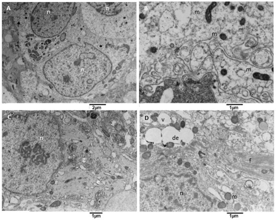 TEM, Neoplastic Cells. (A) The figure shows neoplastic cells (n) with a centrally located oval nucleus and cytoplasm rich in organelles, such as mitochondria. (B) Mitochondria (m) appear small and with a dense and dark matrix. (C) Some neoplastic cells show a well-developed Golgi apparatus (g) and moderately developed endoplasmic reticulum (e). (D) Some other cells contain glial filaments in the cytoplasm (f), mitochondria (m), vacuoles (v), and dilated endoplasmic reticulum (de).