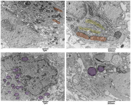 TEM, mitophagy in neoplastic cells. (A) A neoplastic cell is depicted. It is visible in the nucleus (n) and a prominent nucleolus. The cytoplasm contains dilated endoplasmic reticulum (de), and active mitochondrial fission (orange) can be observed. (B) This neoplastic cell shows a mitochondrion (orange) in the final stages of fission. A duplicated Golgi organ (yellow) is present. (C) A neoplastic cell with multiple mitochondria in advanced stages of mitophagy (violet) is represented. (D) At high magnification, two mitophagy figures (violet) are presented; note the cristae remnants inside the left mitophagy mitochondrion. Glial filaments (f) are also present in the cell cytoplasm.