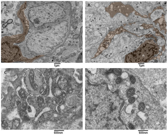 TEM, Microglia Cells. (A) A microglia cell (brown) surrounds two neoplastic cells (n) with two long processes. Bar 1 micron, (B) A microglia cell (brown) presenting multiple long processes in which a dilated endoplasmic reticulum (de) is visible. (C) Detail of a microglia cell cytoplasm showing mitochondria entrapped in a network of filaments (oval dotted line). (D) Detail of a microglia cell cytoplasm showing mitochondria (m) tethering with the dilated endoplasmic reticulum (de).