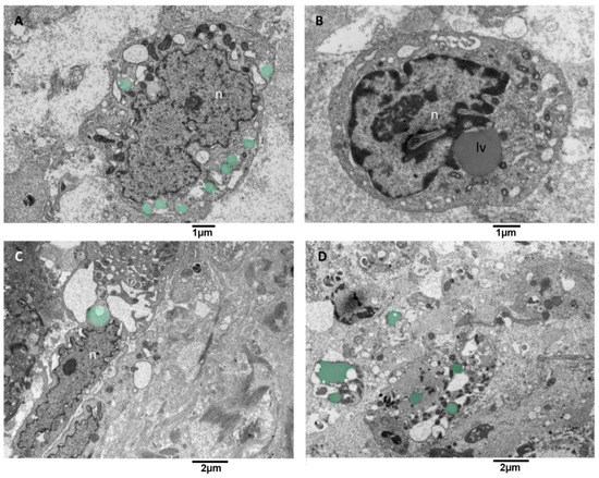 TEM, Microglia cells with lipid vesicles. (A) in this cell, multiple small lipid vesicles (green) surround the nucleus (n), and the endoplasmic reticulum appears enlarged. (B) this cell presents a single large lipid vesicle (lv) in tethering with the nucleus (n). (C) microglia cell with an elongated nucleus and severely dilated endoplasmic reticulum is shown; note the lipid vesicles in green near the nucleus (n). (D) This panoramic view shows the cytoplasm of different cells containing lipid vesicles (green).
