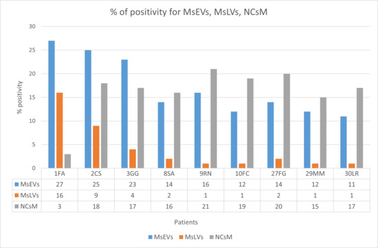 Percent of positivity for MsEVs (blue), MsLVs (orange), and NCsM (gray) in each patient. Note that high values of MsLVs are present in the same patient with high MsEVs. Values of NCsM appear instead almost constant among patients.