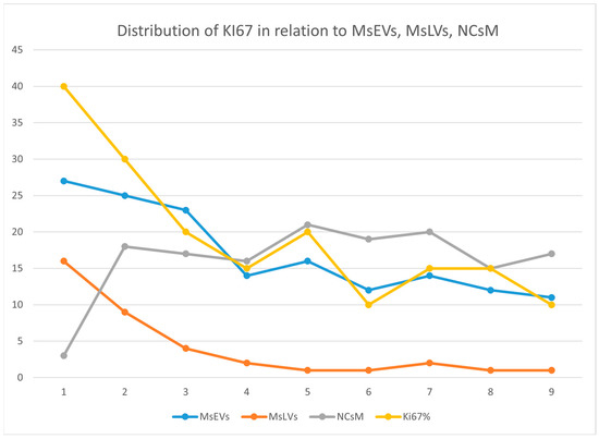 This figure illustrates the distribution of Ki-67 (yellow), MsEVs (blue line), MsLVs (orange line), and NCsM (gray line). High values of Ki-67 are related to high values for both MsEVs and MsLVs. Values of NCsM appear not related to Ki-67, having its value distribution line a different trend than that of Ki-67.