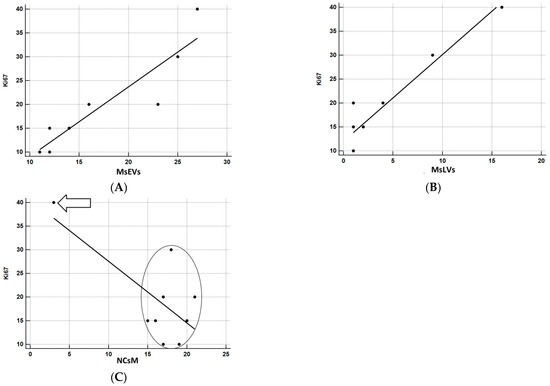 (A) Correlation analysis between Ki67 and MsEVs. r = 0.918, p < 0.0001; this result demonstrates the strong association between these two parameters, as it also appears clear by the regression line orientation the amount of MsEVs increases with increasing Ki-67. (B) Correlation analysis between Ki67 and MsLVs. r = 0.951, p < 0.0001; even in this case demonstrates the strong association between these two parameters, the regression line indicates that as the amount of MsLVs increase, the same is for Ki-67. (C) Correlation analysis between Ki67 and NCsM. r = −0.704, p < 0.05. Arrow: a single subject with very high scores in KI67 and very low scores in mitophagy. In the circle, all other subjects were comprised. A clear pattern of association between the two variables is not present in this case.