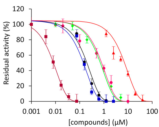 IC50 determination of compounds 2 (●), 24 (▲), 31 (◼), 34 (♦), 37 (●) and PBTZ169 (◼), against the DprE1 activity.