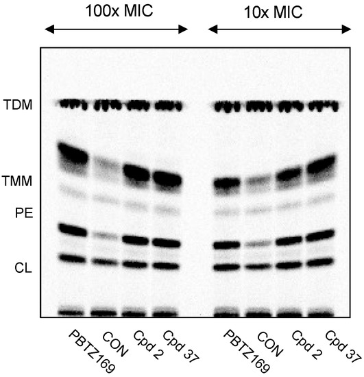 The ability of the compounds 2 and 37 to inhibit the DprE1 enzyme in Mtb H37Rv was examined via [14C]-acetate metabolic labeling, as described before (Figure 3) [8,14]. Analysis of the extractable lipids from radiolabeled bacteria by TLC points out to similar profiles for PBTZ169 and the two tested inhibitors, suggesting the same mechanism of action. The cultures treated with the inhibitors accumulated trehalose monomycolates (TMM) and trehalose dimycolates (TDM) compared to the control bacteria, which indicates interference with the build-up of the mycobacterial cell wall core. DprE1 inhibition causes deficiency in the synthesis of arabinan chains serving as attachment sites for mycolic acids, which then incorporate to soluble lipids, TMM and TDM.