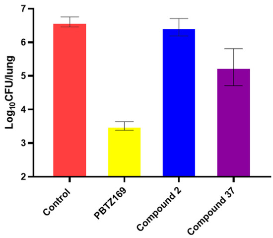The anti-TB potential of the compounds was evaluated using a mouse model acutely infected with Mtb H37Rv. Both compounds were administered: oral dose 50 mg/kg for 4 weeks, once per day, except weekends. PBTZ169 killed Mtb by 3 logs in the lungs compared to the control group (Figure 4). By comparison, compound 37 reduced the bacteria load by 1.2 logs; compound 2 barely displayed efficacy.