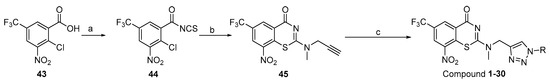 Reagents and conditions: (a) oxalyl chloride, a drop of DMF, DCM, 0.5 h, then, NH4SCN, DCM/CH3COCH3 = 5:1, 1.0 h, rt; (b) N-methylpropagyl amine, 2.5 h, DCM, yield: 65%; (c) corresponding azide R-N3, CuSO4, K2CO3, sodium ascorbate, EtOH/H2O, rt, 16 h, yield: 40–68%.
