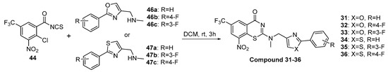 Compounds 31–36 were prepared as shown in Scheme 2. The reaction intermediates 46a–c and 47a–c were prepared according to the published procedure [8]. The final cyclization reaction between 44 and the above intermediates yielded compounds 31–36 in medium yield.