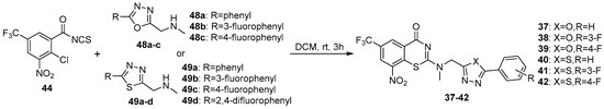Compounds 37–43 were prepared as shown in Scheme 3. The reaction intermediates 48a–c and 49a–c were prepared according to the published procedure [8]. The final cyclization reaction of 44 with the above intermediates provided the target compounds 37–42 in 30–50% yields.