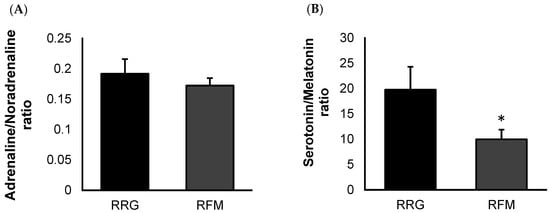 No significant differences between FM patients and the control group (in accordance with data from our previous study [27]) were found in the systemic levels of oxytocin (1229 ± 171 µg/mL vs. 1248 ± 120 µg/mL, respectively), serotonin (135 ± 14 ng/mL vs. 271 ± 79 ng/mL, respectively), melatonin (13 ± 1 µg/mL vs. 17 ± 2 µg/mL, respectively), adrenaline (31 ± 2 µg/mL vs. 32 ± 4 µg/mL, respectively), and noradrenaline (185 ± 9 µg/mL vs. 168 ± 8 µg/mL, respectively), in this last case with a clear tendency to be higher (p < 0.07). Figure 1 represents the adrenaline/noradrenaline ratio (Figure 1A) and serotonin/melatonin ratio (Figure 1B) of their systemic concentrations. As expected, when evaluating the adrenaline/noradrenaline ratio, no significant differences were observed between the groups. However, FM patients (RFM) showed lower (p < 0.05) serotonin/melatonin values than those obtained the reference group (RRG).