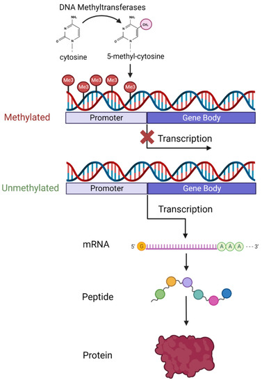 Diagram showing the process of DNA methylation and how methylation at the promoter region of genes affects transcription and ultimately protein expression levels. Created with BioRender.com accessed on 22 May 2023.
