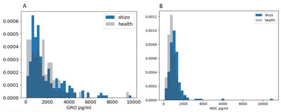 Examples of distributions of GRO (A) and MDC (B) concentration data in samples of schizophrenic patients and healthy individuals.