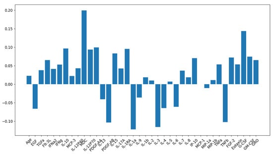 In some cases, the relationship between variables may be linear. In these cases, linear predictive models can be used. Therefore, linear dependencies between variables were analyzed. A histogram of the linear correlations between the markers used and the main sign that distinguishes healthy and sick subjects is shown in Figure 2. It has been shown that no features have a high correlation value, making it difficult to use linear classification models to differentiate between patients and healthy control groups. The maximal correlation for chemokine MDC/CCL22 is about 0.2. Therefore, more complex models have been applied to classify patients and healthy individuals.